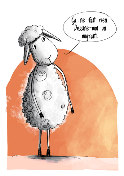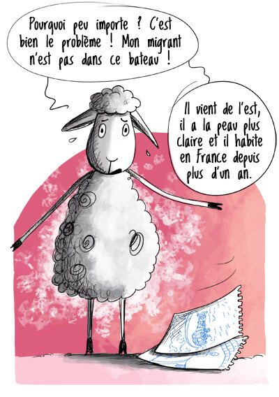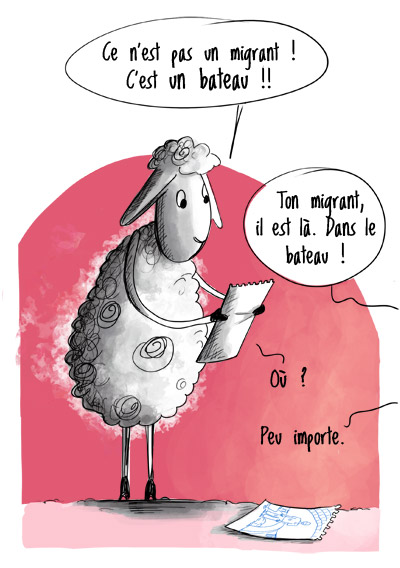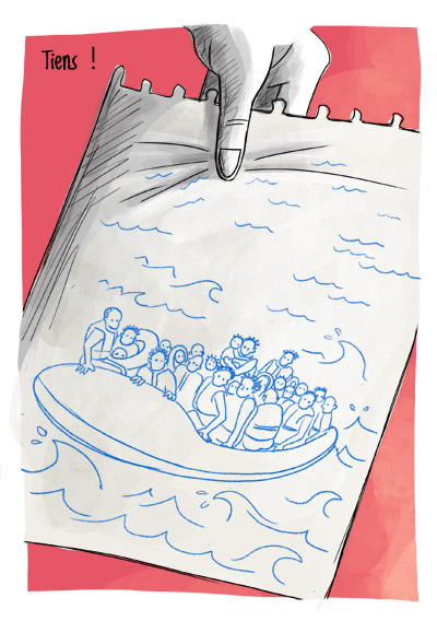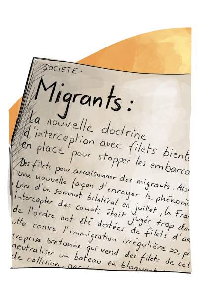 Case n°3 : l’article de journal dessiné sur la case n°3 ci-dessus est inspiré d’un article paru sur lemonde.fr » « Small boats » de migrants dans la Manche : la nouvelle doctrine d’interception avec filets bientôt en place « , publié le 19 novembre 2025.